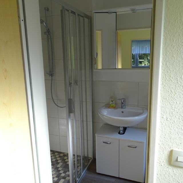 Das Badezimmer besitzt neben dem Waschbecken mit Spiegelschrank und der Toilette eine geräumige ebenerdige Dusche. Auch ein kleiner Satz Handtücher ist vorhanden. Handtücher werden nach Vereinbarung regelmäßig ausgetauscht.