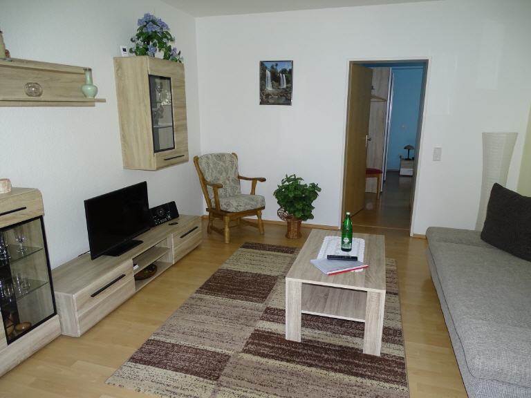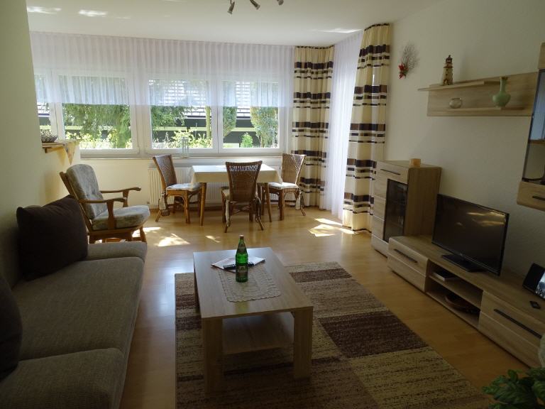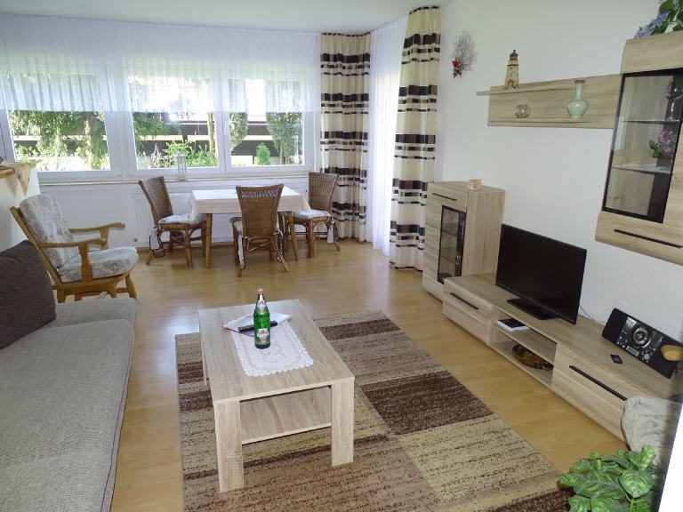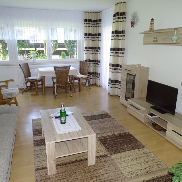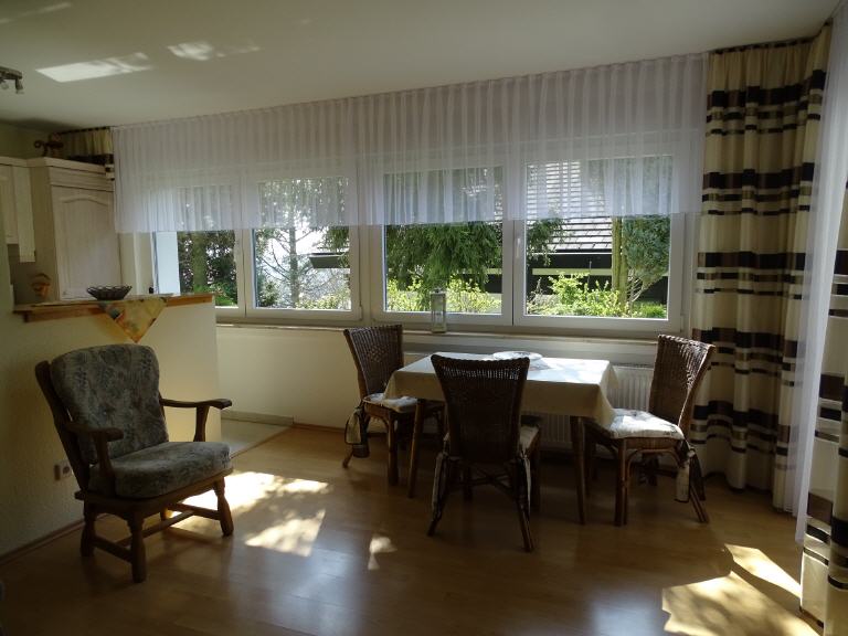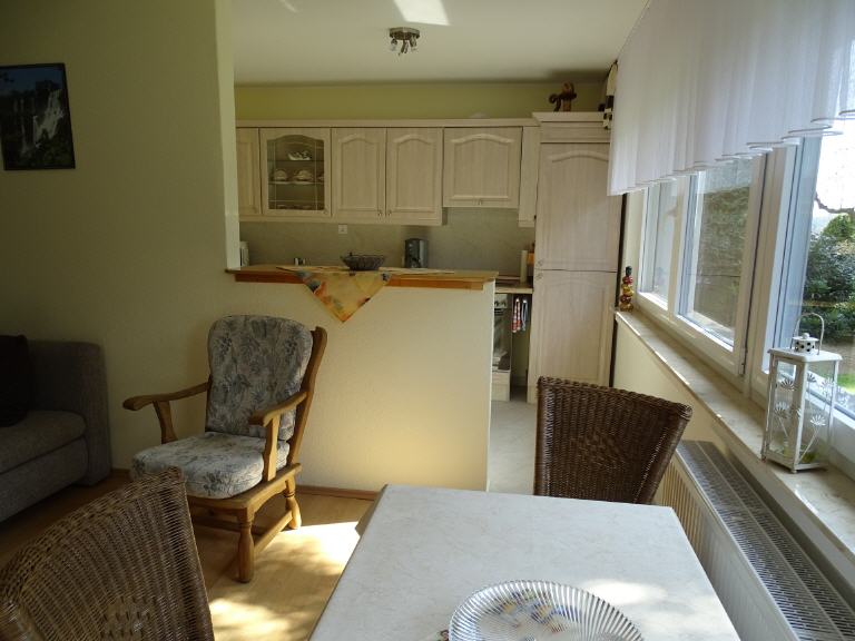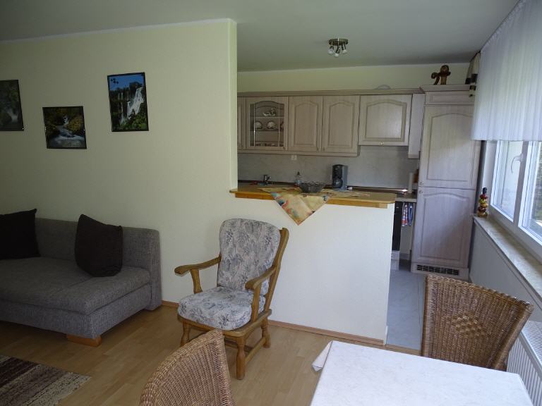 Das Wohnzimmer ist zur Küche offen und durch einen kleinen Tresen getrennt. Im Wohnzimmer haben Sie eine kleine Essecke und Sie können es sich auf der Couch oder den Sesseln gemütlich machen.